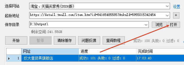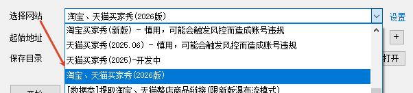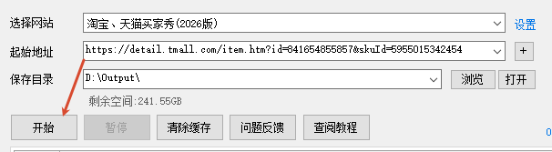 一、打开软件,网站选择 淘宝、天猫买家秀(2026),起始地址处输入商品网址,然后点开始按钮